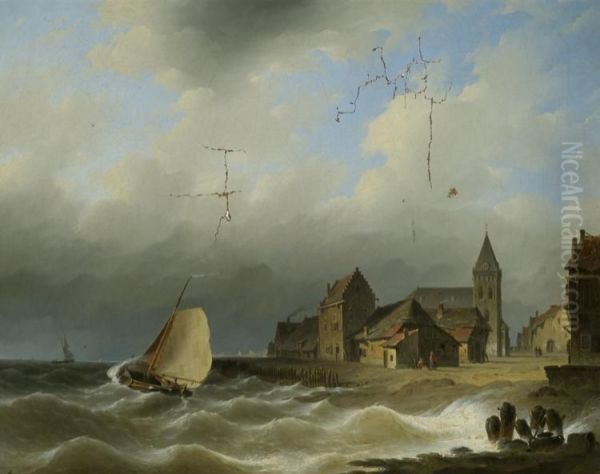 Sailing Vessels Off The Coast Near A Dutch Town