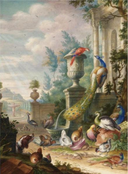 Peacocks, A Parrot And Other Fowl, Watched By A Spaniel, In A Classical Park Landscape