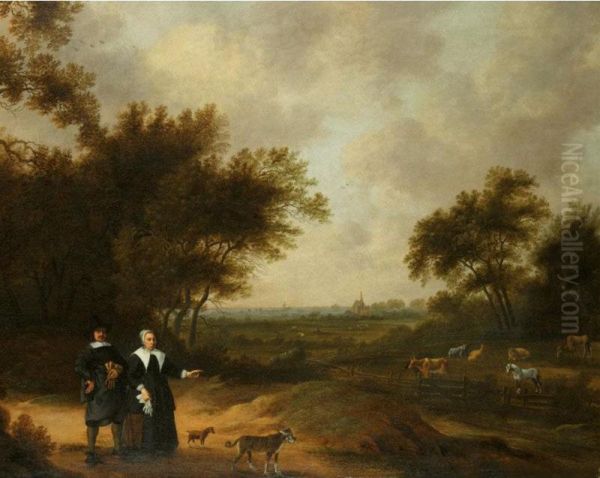 A Double Portrait Of A Couple Promenading With Their Dogs Through Their Country Estate