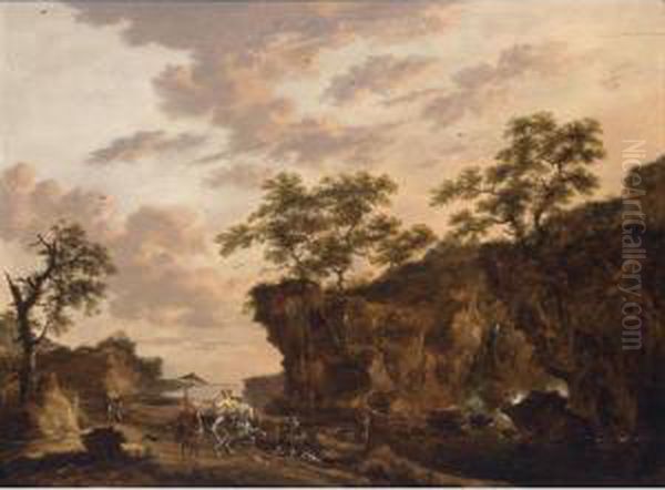 A Southern Landscape With A Wooden Bridge And Travellers By A Bluff With Their Horses And Dogs