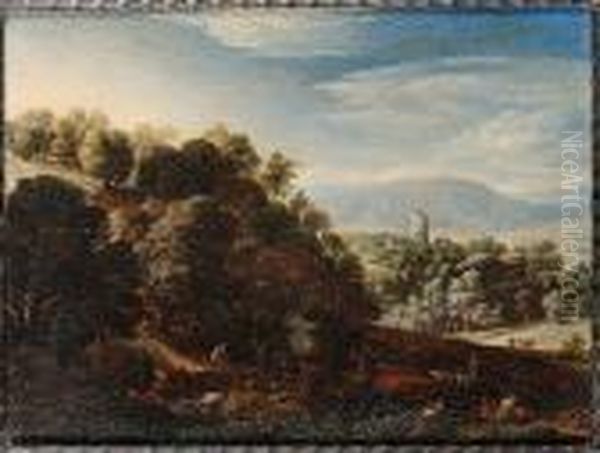 A Wooded Landscape With Figures Resting, A Traveller Crossing A Bridge And A Goatherd Tending His Flock, A View To A Village And Church Beyond
