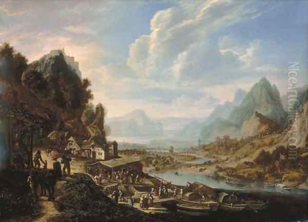 An extensive river landscape with peasants disembarking