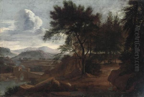 A Wooded River Landscape With A Castellated Bridge And A Hill-topvillage Beyond