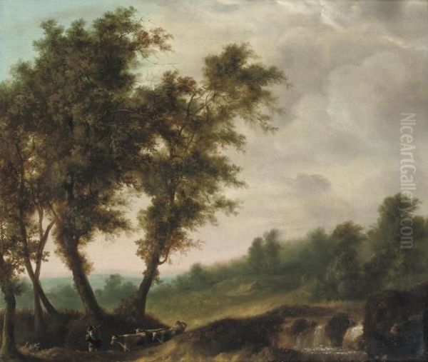 Peasants With Their Cattle In A Wooded River Landscape