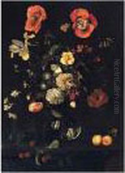 Still Life Of Roses, Poppies, Irises And Other Flowers In A Glass Vase, With Apricots And Cherries On A Ledge