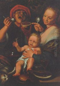 A Kitchen Interior With A Peasant Family Around A Fireplace