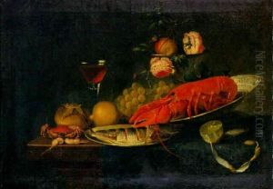 A Still Life Of Fruit, An Up-turned Porcelain Bowl And A Chest, With A Negro Page Appearing From Behind A Draped Curtain