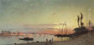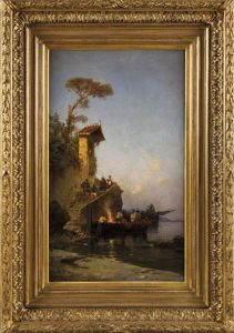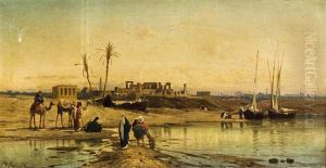 Nillandschaft Mit Agypterinnen Beim Wasserholen, Im Hintergrund Darstellung Der Pyramiden