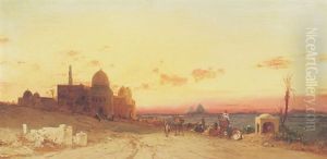 Nillandschaft Mit Einer Moschee Bei Sonnenuntergang. Im Hintergrund Blick Auf Die Pyramiden Von Gizeh