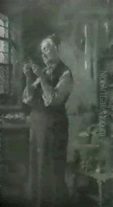 Bauer Mit Tabakspfeife In Der Kuche Am Herd Stehend