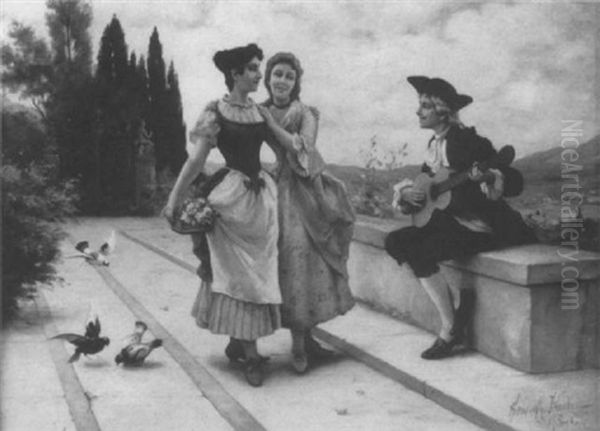 Betorender Gitarrenspieler Und Zwei Blumenmadchen Im Park