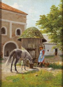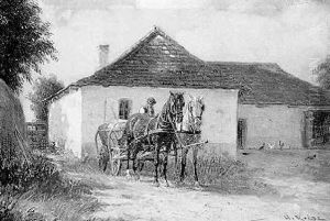 Ungarisches Motiv Mit Eselkarren Und Einem Geschirrverkaufer
