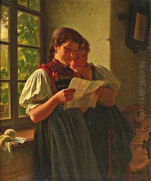 Am Fenster Stehend Lesen Zwei Bauernmadchen Einen Brief