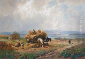 Spatsommerlandschaft Mit Bauern Bei Der Heuernte