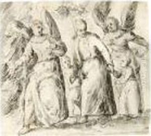 Christus Fuhrt Zwei Kinder, Von Engeln Begleitet.