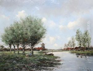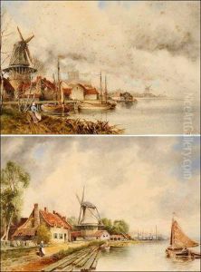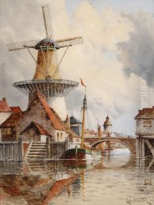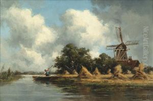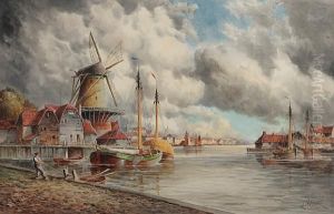 A Dutch Canal Scene With Windmill, Houses And Boats.