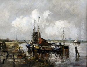 Louis Van Staaten Near Rotterdam,harbour Scene With Sailing Barges