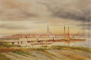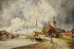 Dutch Quayside Scene With Washerwomen Andestuary Beyond