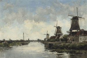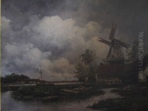 A Dutch Port With A Windmill Beyond (+ A Boat On An Estuary; Pair)