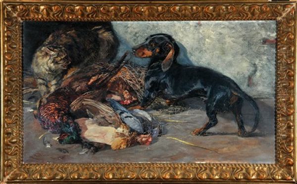 Katze Und Dackel Mit Erlegtem Federvieh