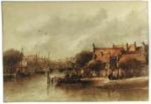 Paysage Aquatique En Hollande Avec Maisons Au Bord De L'eau Et Figures Dans Une Chaloupe