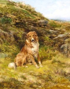 A Dog Seated On A Grassy Bank, Possibly A Collie