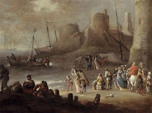 A Mediterranean Coastal Landscape With Elegant Figures On A Beach With Fishermen Unloading Their Catch, A Fortified Town Beyond
