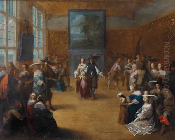 An elegant party in a palace interior with figures conversing and dancing