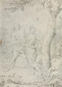 Portrait Of A Lady, Three-quarter Length, Standing In A Wooded Landscape With A Spaniel And A Perroquet In A Tree Nearby