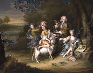 A Mother Nursing A Child In An Interior, Together With Two Young Boys Taking Cherries And An Elderly Woman Bringing A Basket With Eggs