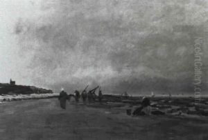 River Landscape With Fishing Trawlers Moored And Washerwomen