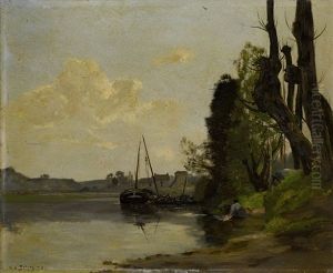 Flusslandschaft Mit Zwei Wascherinnen Im Mittelgrund