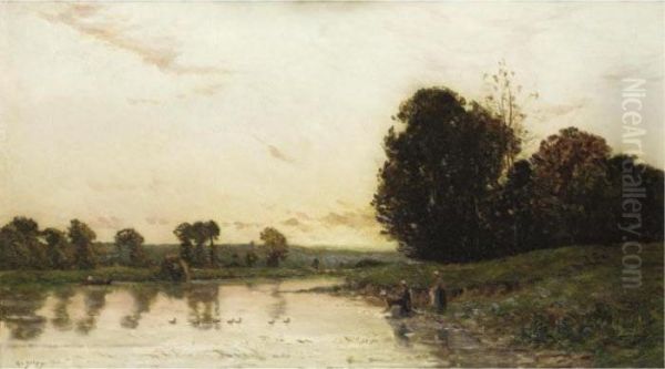 River Scene At Sunset With Washer Women