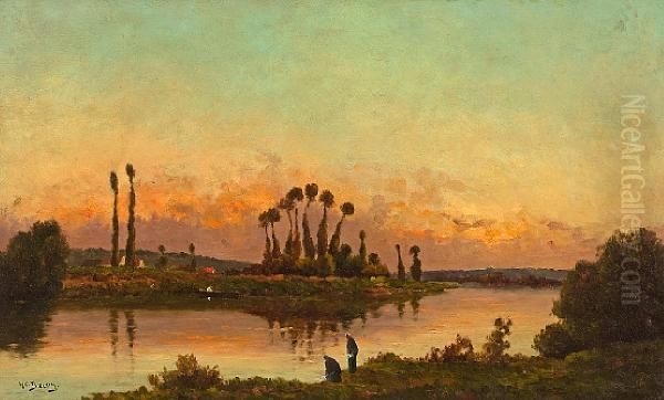 Washerwomen Beside A River At Sunset