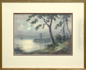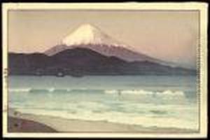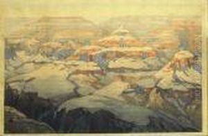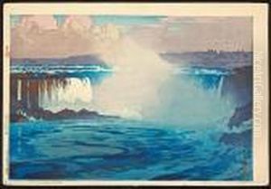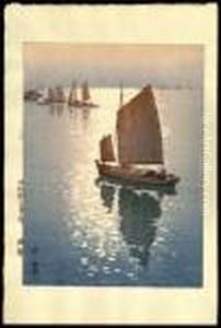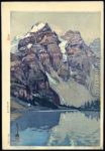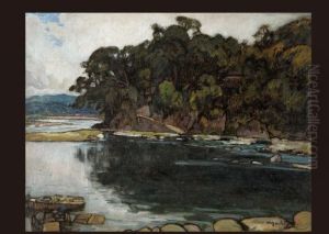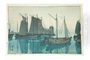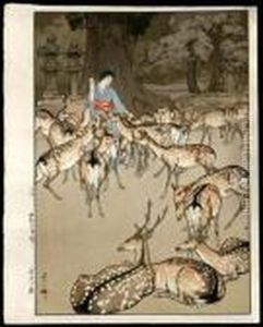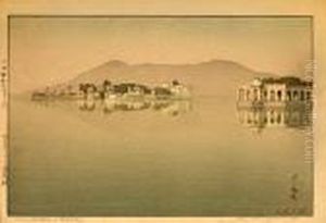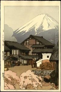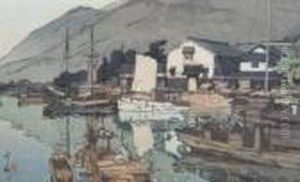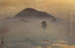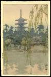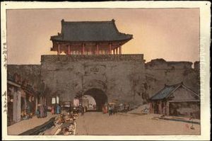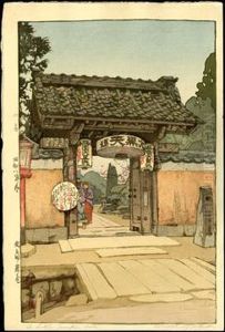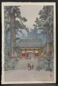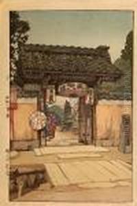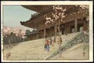 Misty Day In Nikko, A Woman With Child Under A Gate In A Garden With Cherry Blossoms.