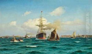 Fragt- Og Passagerskib Sejler Ud Af Kobenhavns Havn Eskorteret Af Talrige Skibe