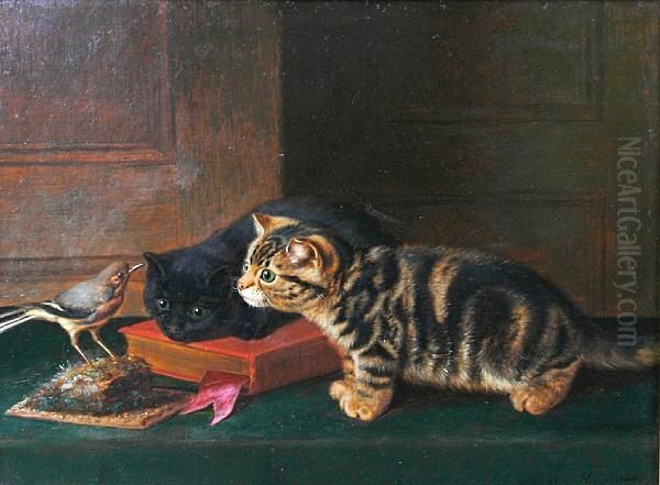 Two Curious Kittens And A Chaffinch