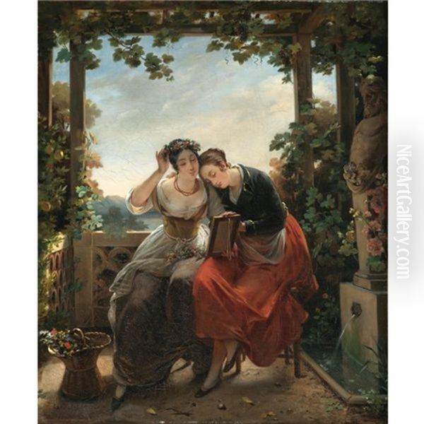 Two Young Ladies Admiring Themselves In A Mirror