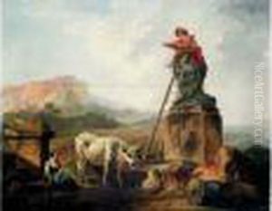 A Fisherman Pulling A Net From A River Near A Small Waterfall, A Woman Resting Nearby, And A Shepherdess On A Horse Crossing A Bridge With Her Flock