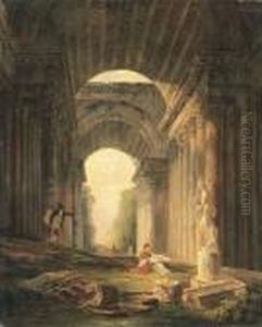 An Extensive Landscape With Children Playing On A See-saw Before A Ruined Temple