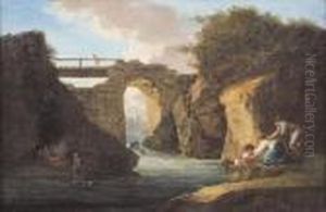 A Capriccio River Landscape With Washerwomen Near A Ruined Bridge