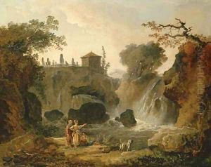 An Italianate landscape with peasants on a bridge before a waterfall