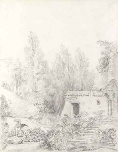 Washerwomen in a stream by a rustic cottage
