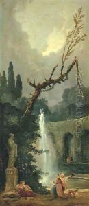 A View Of The Cascade At The Villa D'Este, Rome, With Women Washing Clothes At Its Base
