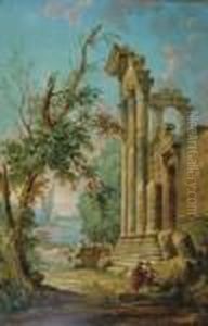 Figures On The Banks Of A Lake With Classical Ruins