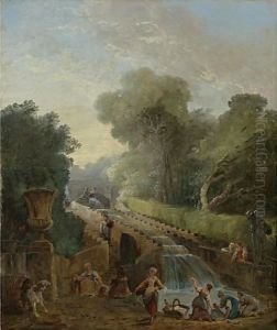 Washerwomen by a fountain in a garden