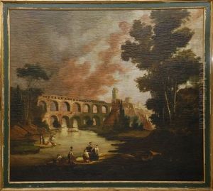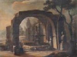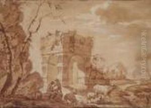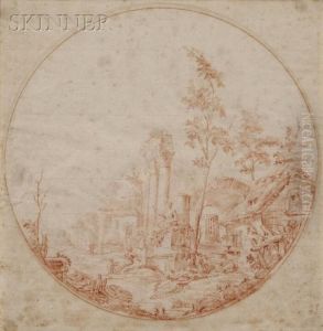An Italianate Landscape With Figures Amongst Ruins Beside A River