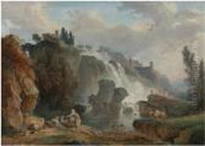 The Cascades At Tivoli With The Temple Of Vesta, Some Figures Resting In The Foreground.