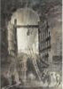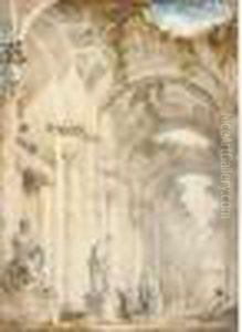 Personnages Dans Une Galerie Voutee; Decoree De Statues