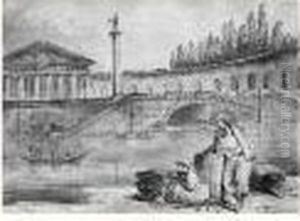 Washerwomen At The Edge Of A River, Beneath A Ruined Circular Temple